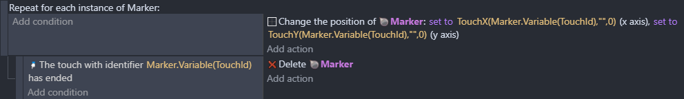 - When the touch moves, the touch identifier is needed to make sure to follow the right touch. A variable can be used to ensure this.