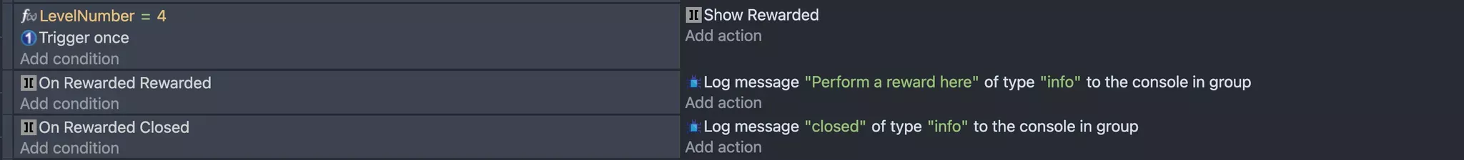 For the purpose of this tutorial, I'll simply add a log to simulate the reward process. However, in your actual game, ensure that the player receives their reward appropriately to comply with platform requirements and enhance player satisfaction.