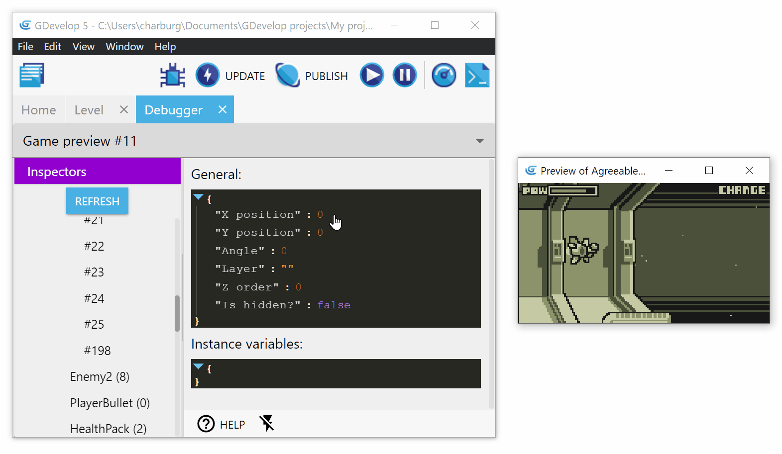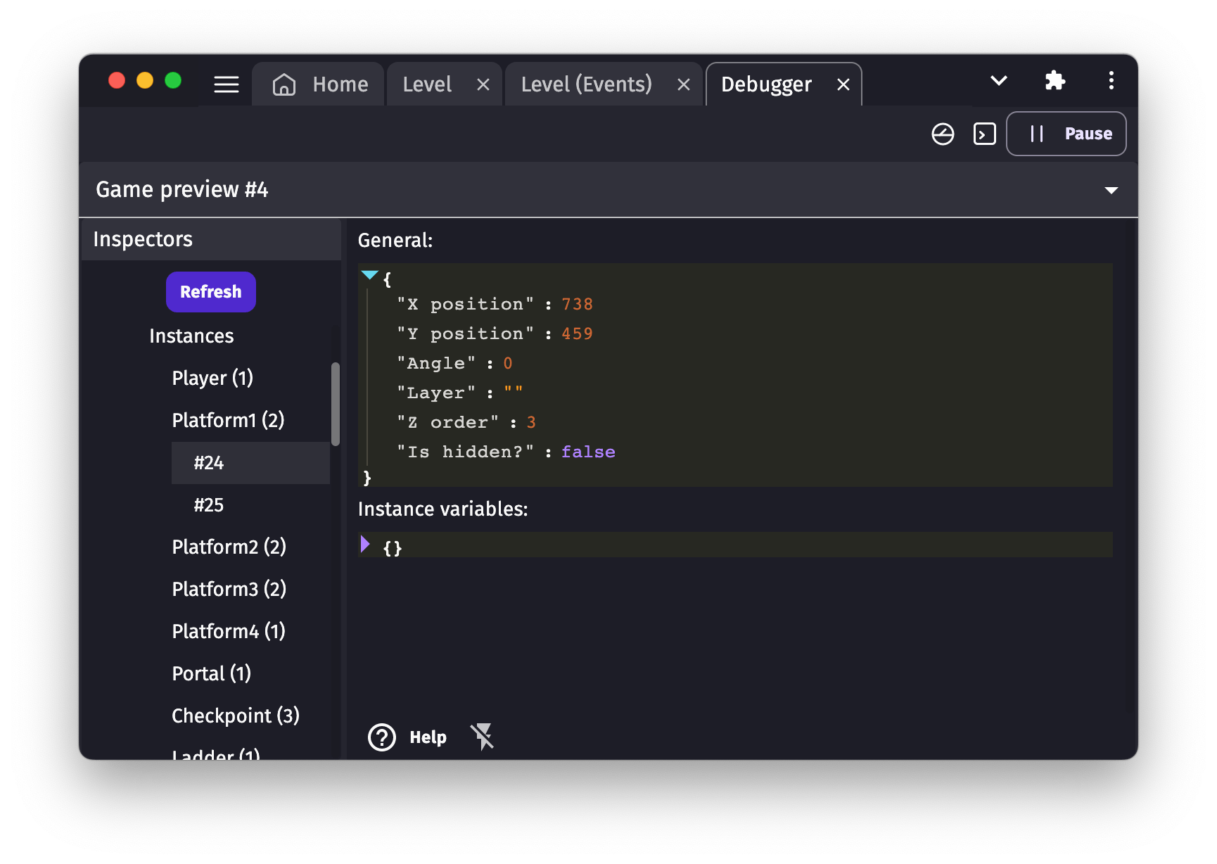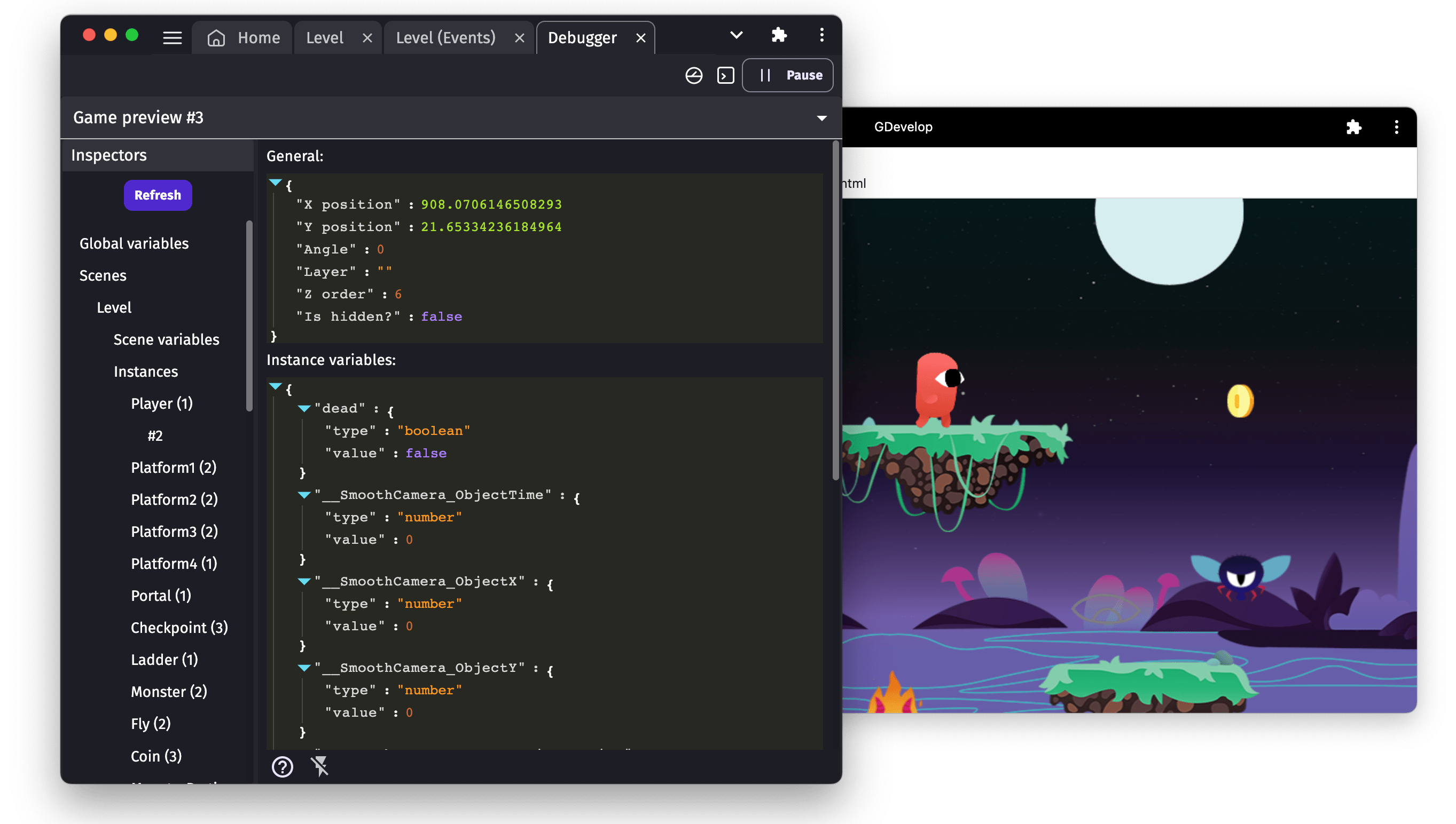 You can inspect variables of the game (global variables), of a scene (scene variables), or of a particular instance of an object (instance variables).