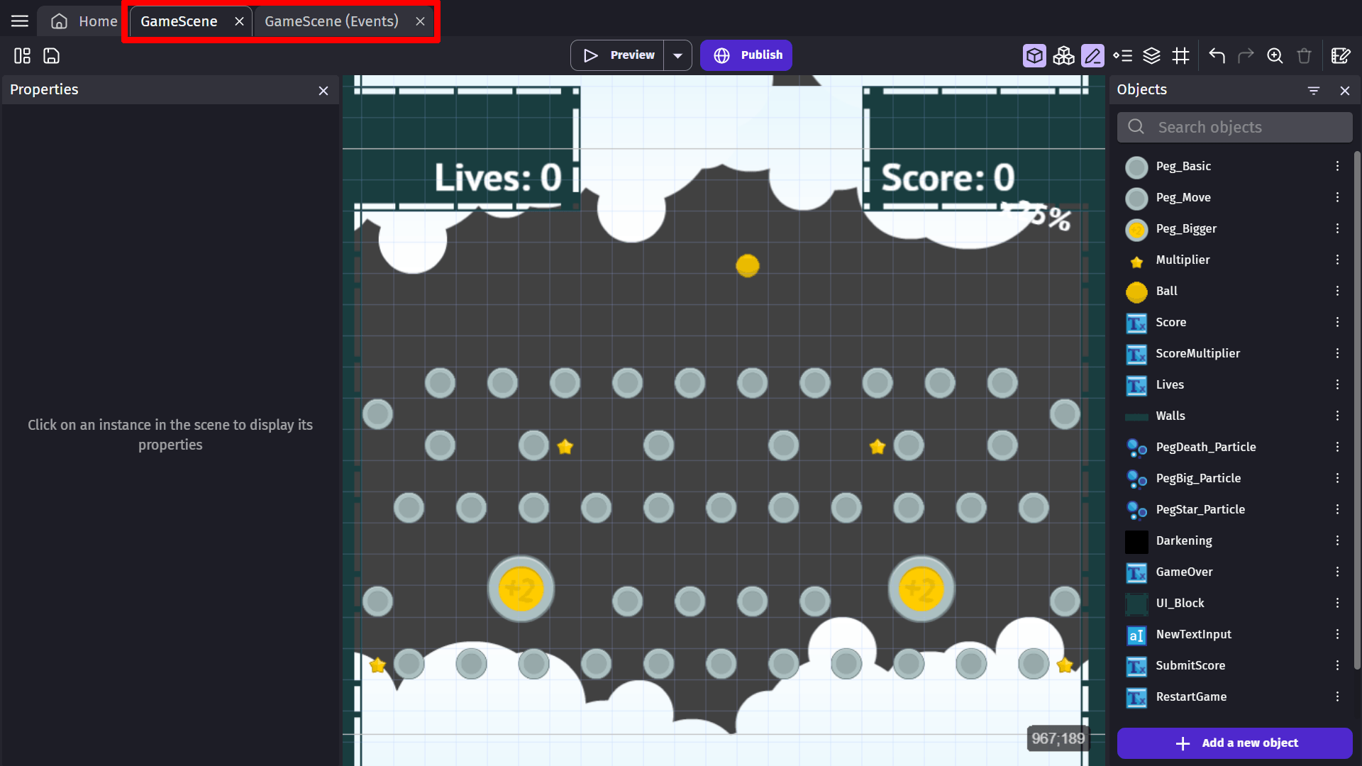 You can add any number of event blocks to the Event editor. Each event can have various conditions and actions. Once you add an event, you can use the conditions and actions to create the game's logic. Read more about conditions and actions.