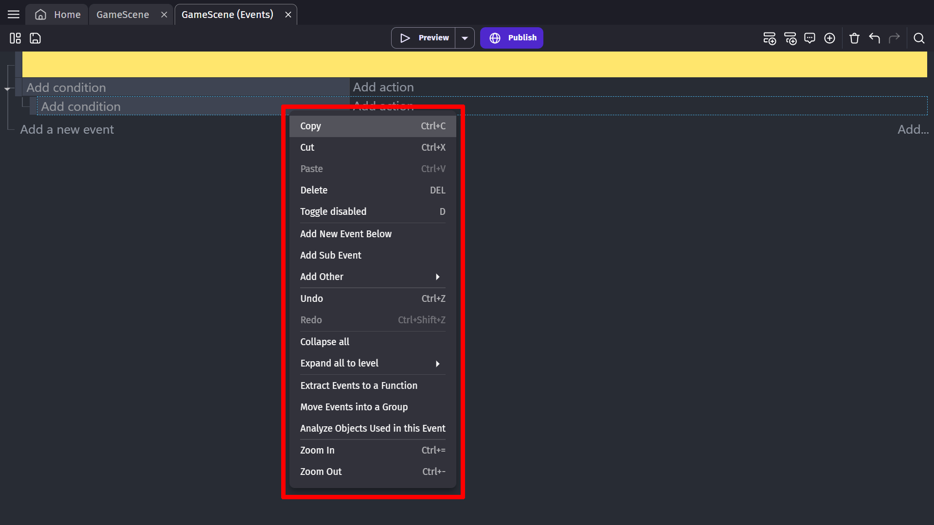 You can edit events on an event sheet by right-clicking on the event you want to edit. A drop-down menu will appear that shows you some of the options you have.
