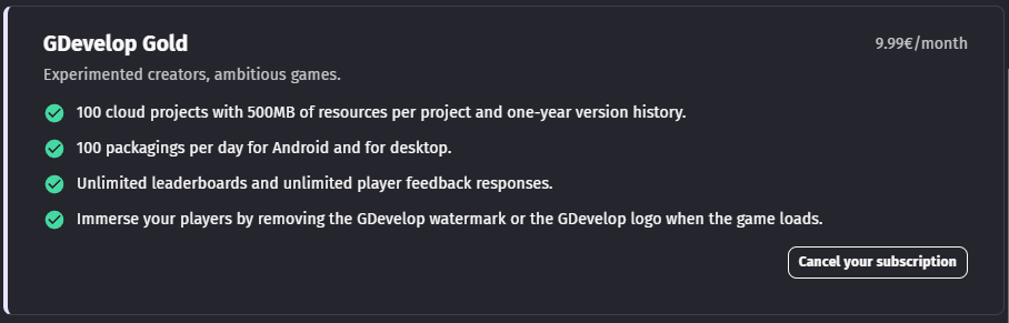 • The current GDevelop subscription running on your account.