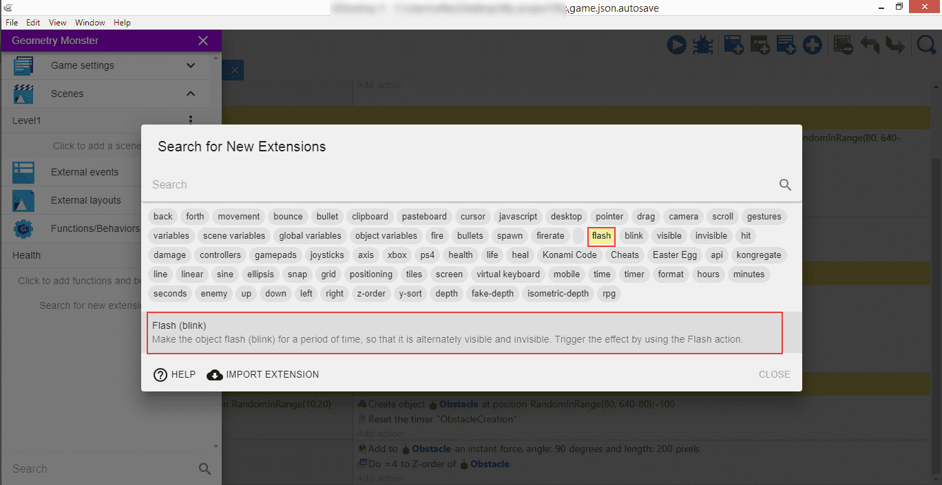 While we're at it, we're gonna add another useful extension - "Flash". When the Monster will get hit by a bomb and lose one life, we will make him blink for a short period of time to give the extra feedback to the player about what happened.