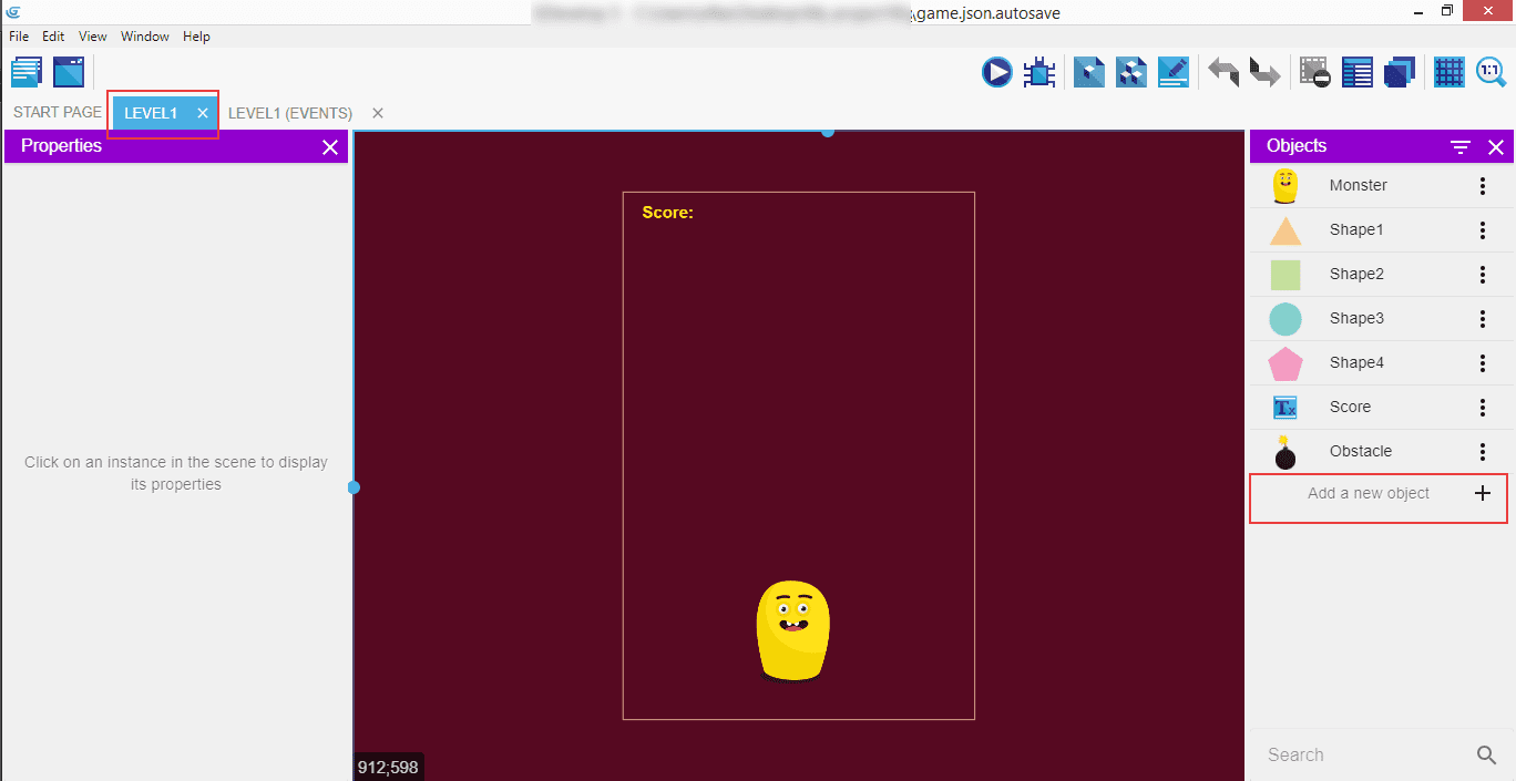 Click the "Level1" tab, and "Add a new object".