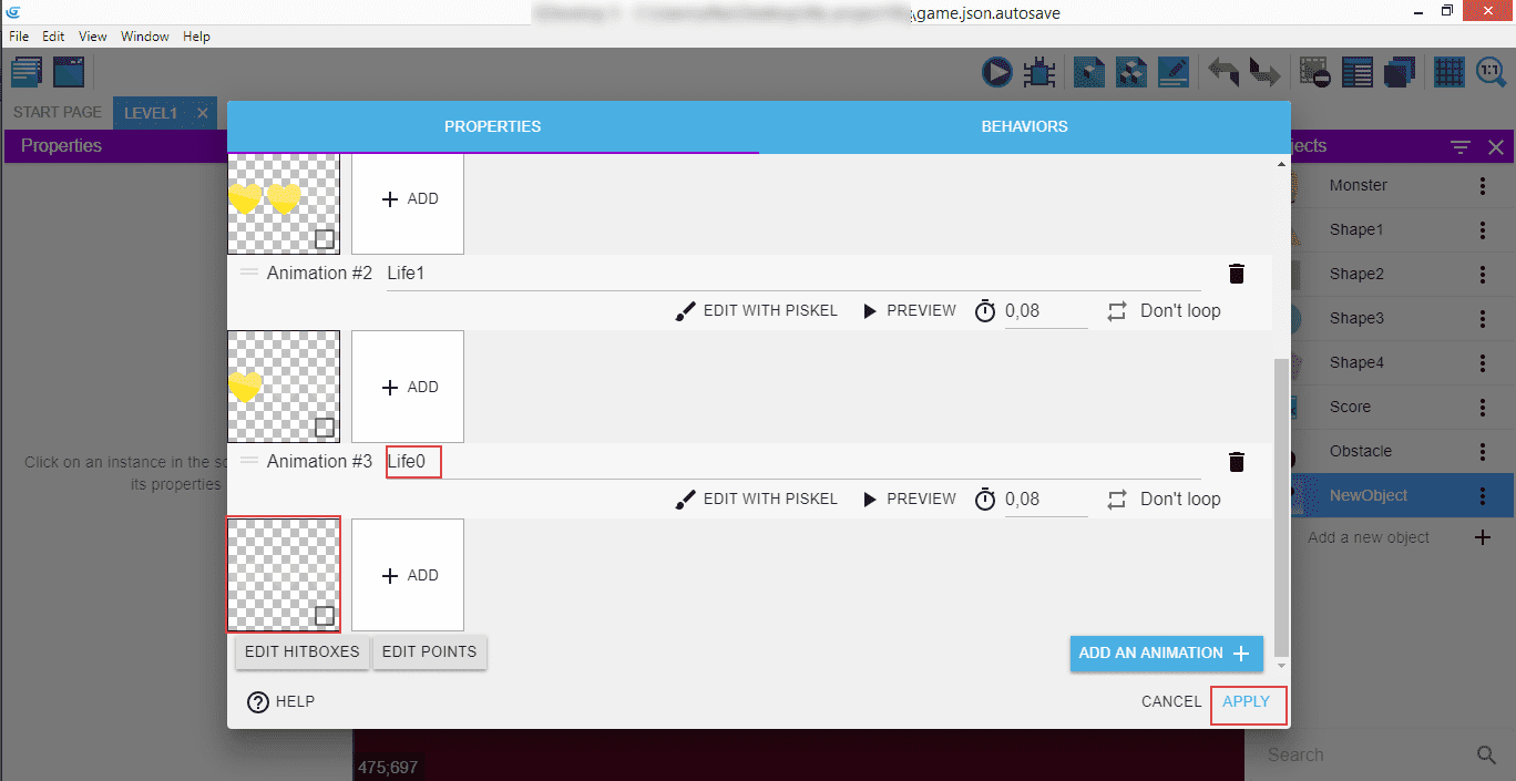 Object's name is "Life", "Animation" is "Life3" (since the initial state of the animation have three lives), and then add the image of the hearts.
