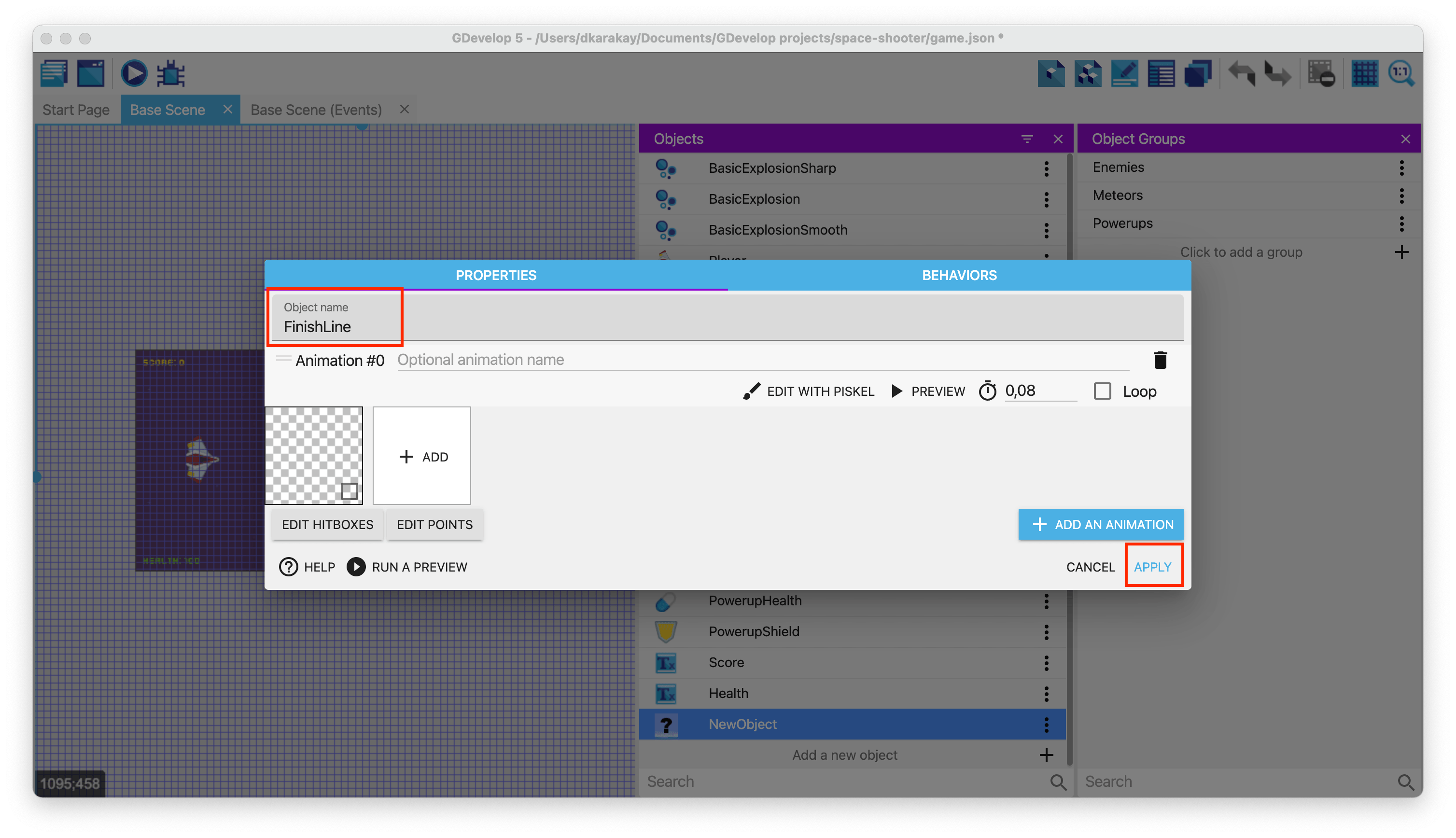 We will add an object called FinishLine to determine the end of the level. Use a transparent image finish_line.png from the assets folder as a sprite.